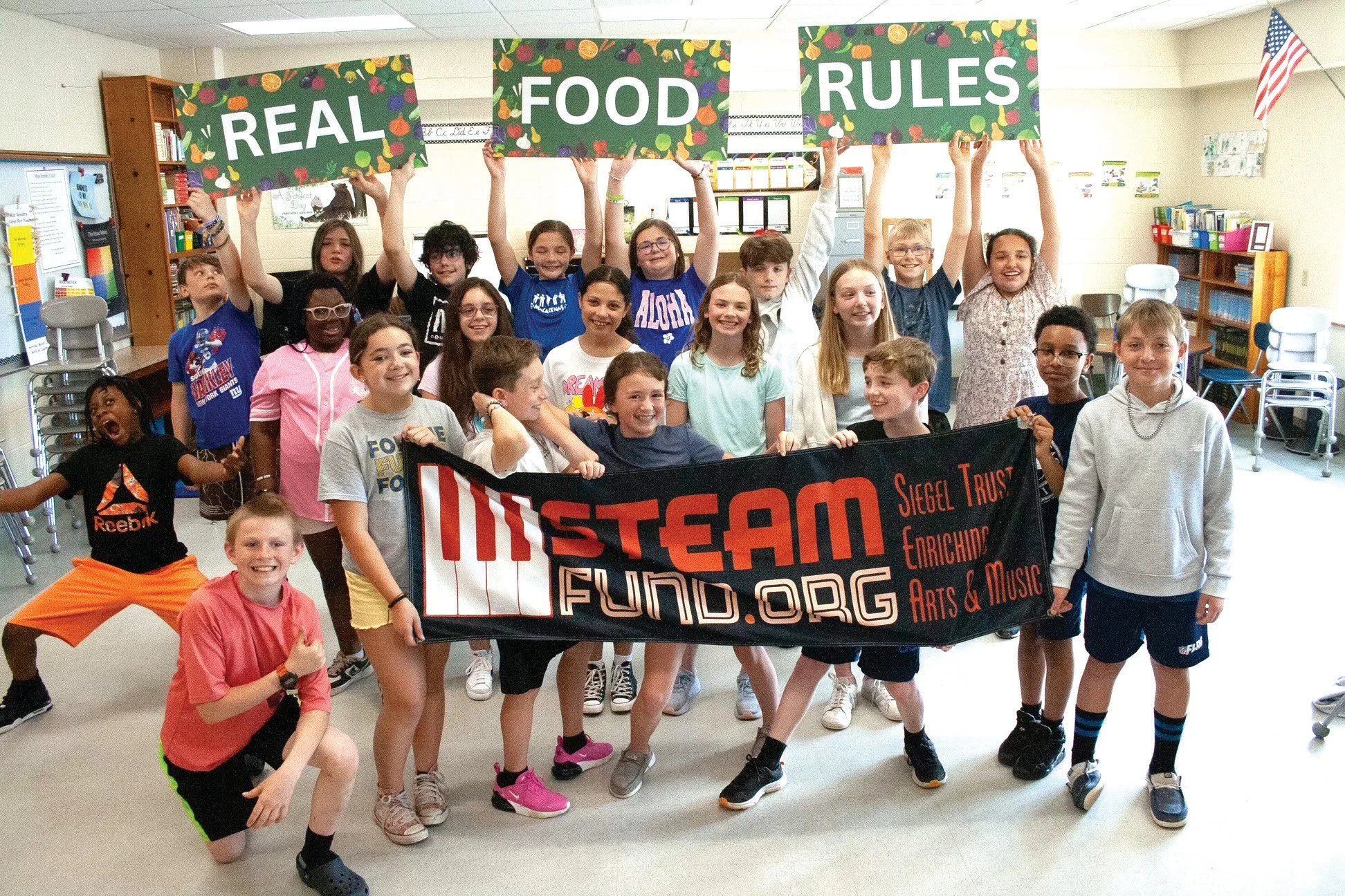 SING OUT! Students strike a pose following a presentation by the STEAM Fund on the benefits of music and good food. The organization supports artists and arts venues, but it also visits schools to promote healthy lifestyles through song. facebook.com/siegelfamilyfund photo