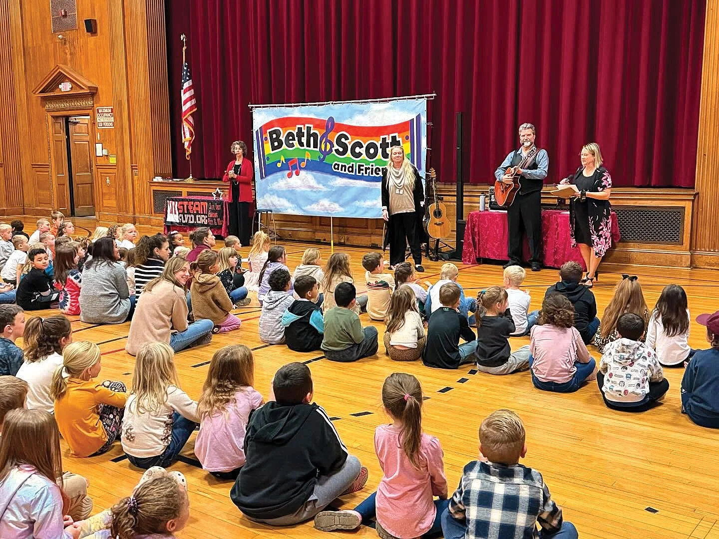HEALTHY TUNES Beth and Scott Bierko present STEAM’s “Real Food Songwriting Program” for an audience of LMCS Elementary School students in the school’s old gym last year. facebook.com/siegelfamilyfund photos